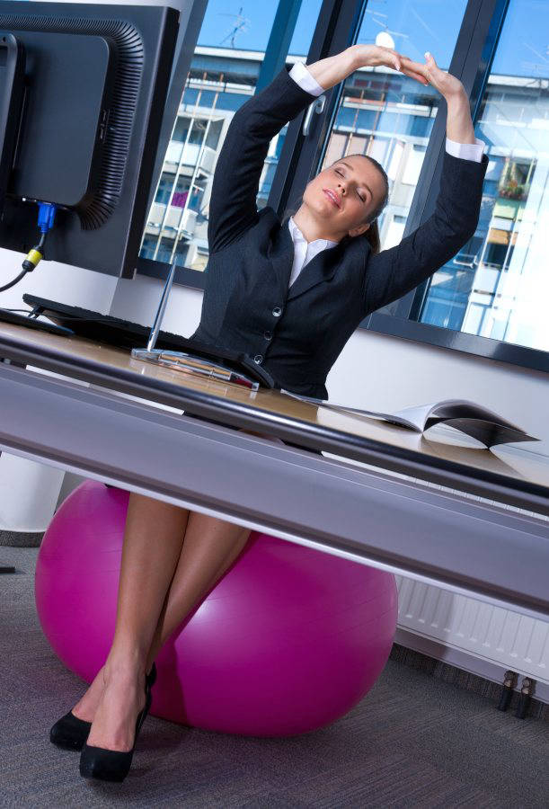 Lleva un balón suizo a la oficina: considera la posibilidad de cambiar tu silla de escritorio por un balón suizo o una pelota de estabilidad bien inflada, siempre y cuando puedas mantener el equilibrio sobre la pelota sin ponerte en peligro. Esto ayudará a mejorar tu equilibrio y tonificará los músculos del tronco mientras trabajas en tu escritorio. Utiliza el balón suizo para hacer sentadillas contra la pared u otros ejercicios durante el día. Ten en cuenta que, en algunos casos, usar una silla de escritorio puede ser lo más adecuado.