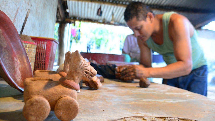 El atiquizayense, de 35 años, es parte de las 30 familias que en la comunidad que se dedican a la elaboración de réplicas mayas, que es lo que realmente hacen, y que venden a personas que luego las comercializan en sitios turísticos del país como El Tazumal, e incluso las trasladan a Antigua Guatemala.