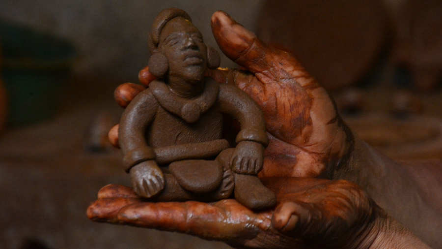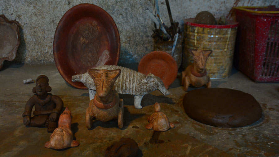 El barro que utiliza lo lleva de un sitio que está a más de 40 metros de distancia de su humilde vivienda, lo remoja y con ayuda de los pies lo aguada hasta dejarlo moldeable para formar las figuras.