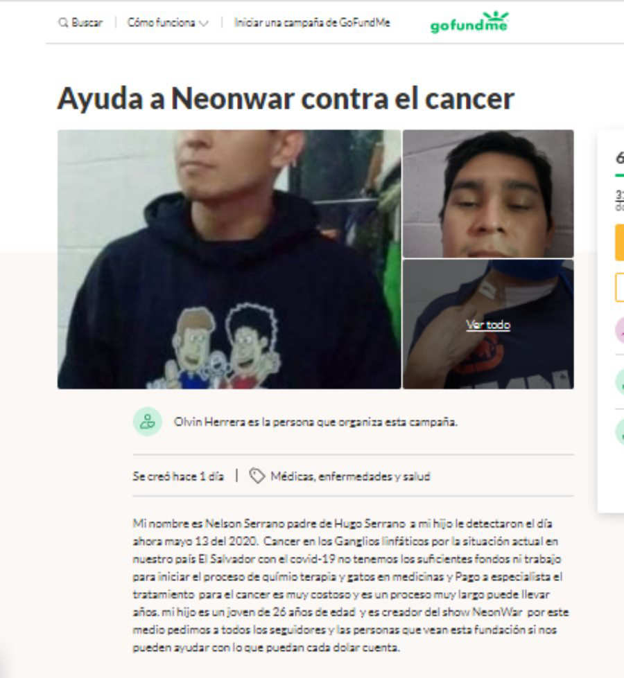 “Por la situación actual en nuestro país El Salvador con el COVID-19 no tenemos los suficientes fondos ni trabajo para iniciar el proceso de quimioterapia, gastos en medicinas y pago a especialista”, señala Nelson Serrano padre del joven quien ha iniciado una campaña en Gofundme para recolectar fondos.