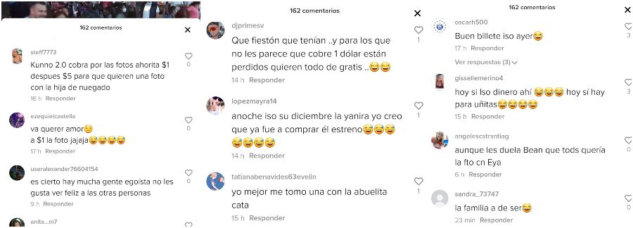 “Kunno 2.0 cobra por las fotos ahorita $1.00”, “Va a querer amor, a $1.00 la foto”, “Que fiestón tenía y para los que no le les parece que cobre $1.00 están perdidos, quieren todo de gratis”, “Hizo su diciembre, la niña Yanira”, se lee en algunos comentarios que acaparan la atención en la web.